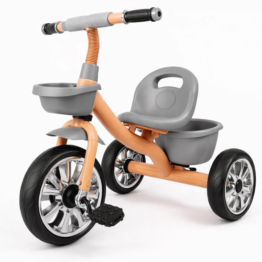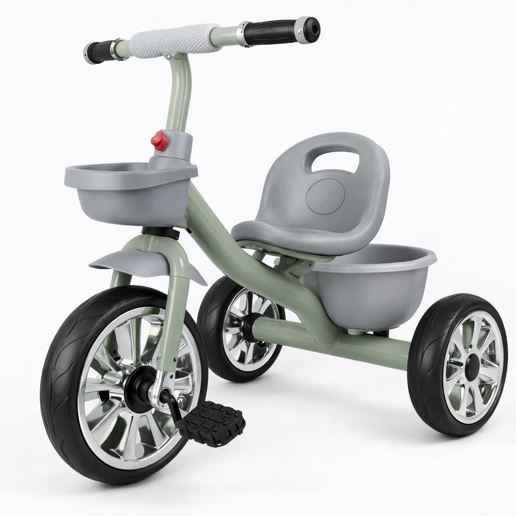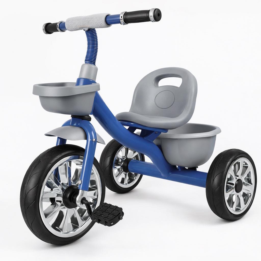 Izrađen je kao tricikl na pedale sa čvrstom metalnom konstrukcijom, što mu daje stabilnost i pouzdanost u svakodnevnoj upotrebi. Sistem sa tri točka omogućava djetetu bolji balans i veću sigurnost tokom vožnje.